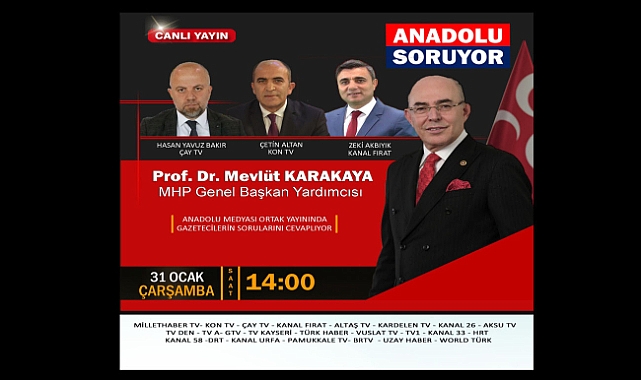 Anadolu Yayıncılar Federasyonu tarafından hazırlanan Anadolu Soruyor Programı'nın konuğu MHP Genel Başkan Yardımcısı Prof. Dr. Mevlüt Karakaya olacak. Anadolu medyasından ortak yayınlanan program 31 Ocak Çarşamba Saat 14:00'de